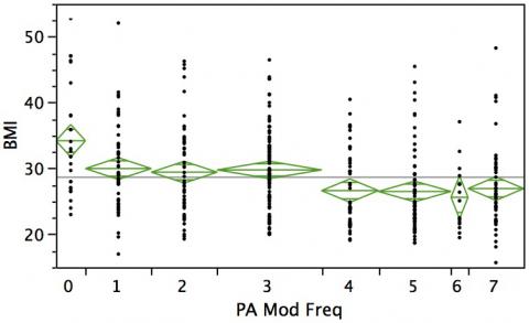 • On balance, there is a linear inverse relationship between days of MVPA each week and BMI, with some suggestion of slight benefit for doing 1-3 or 4 days per week, additional benefits for doing at least 5 days and - perhaps - the most benefit for doing 6 or 7 days per week,